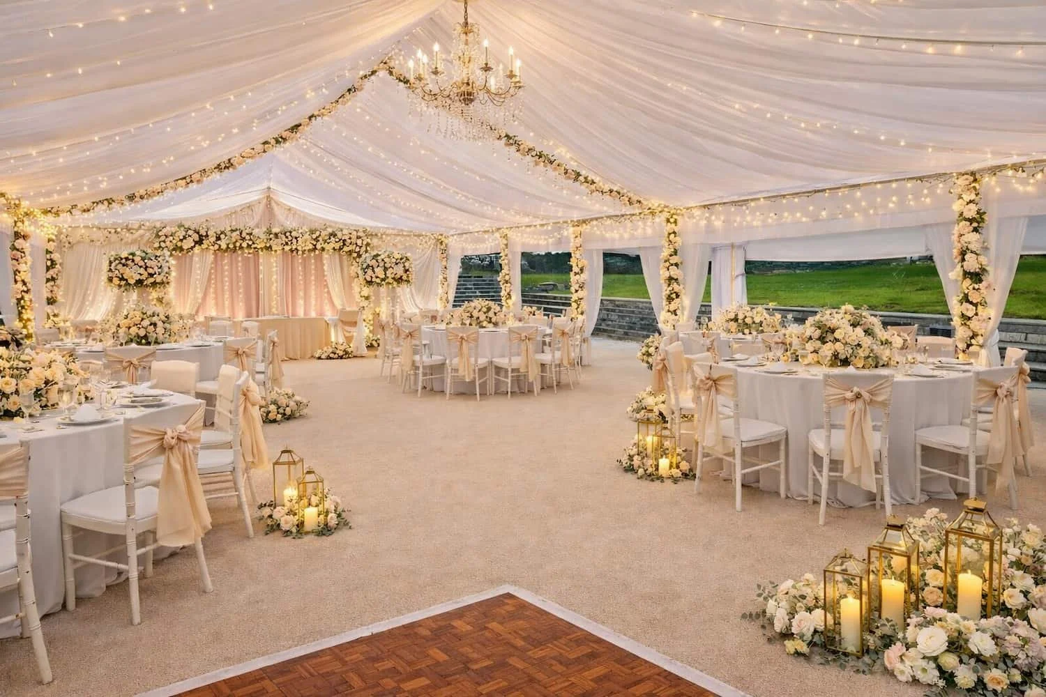 Enhance your marquee with luxury extras such as flooring, lighting, dance floors, tables, chairs, and heating to create the perfect atmosphere for your special day.